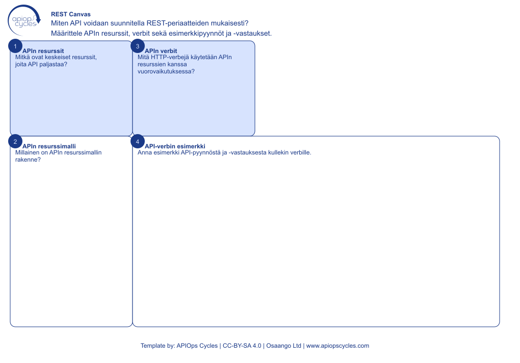 Suunnittele sovellusrajapinnat RESTful-periaatteiden mukaisesti määrittelemällä resurssit, verbit sekä esimerkkipyynnöt ja -vastaukset.